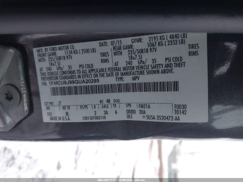 2016 FORD ESCAPE 2016 року Бензин, 2.0, Полный привод, vin - 1FMCU9J99GUA20295 из США
