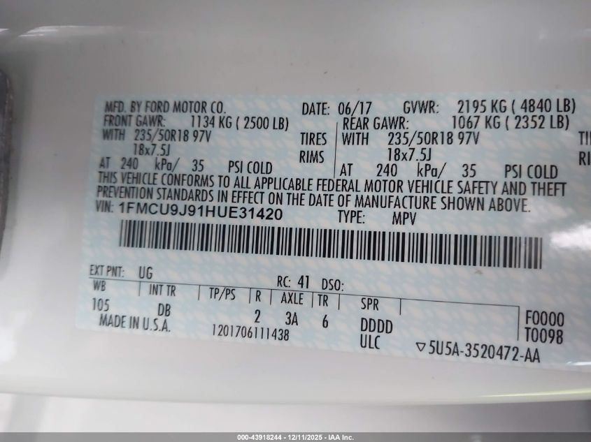 2017 FORD ESCAPE 2017 року Бензин, 2.0, Полный привод, vin - 1FMCU9J91HUE31420 из США