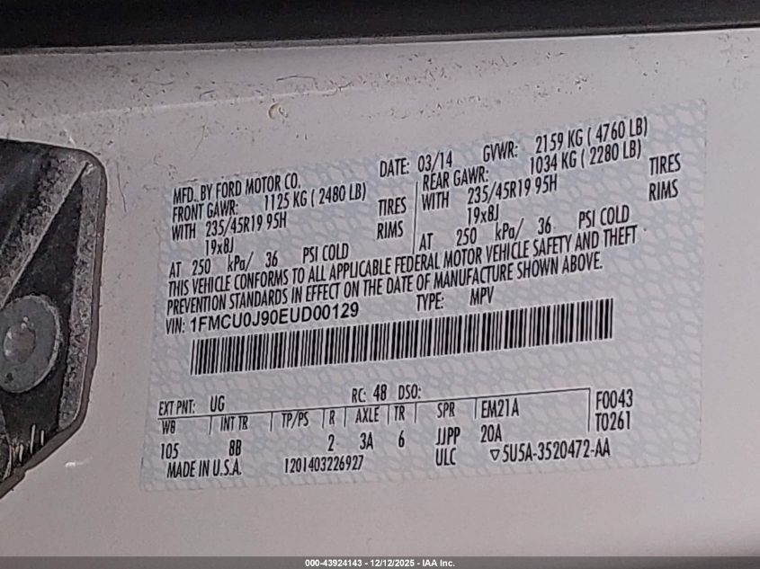 2014 FORD ESCAPE 2014 року Бензин, 2.0, Передний привод, vin - 1FMCU0J90EUD00129 из США