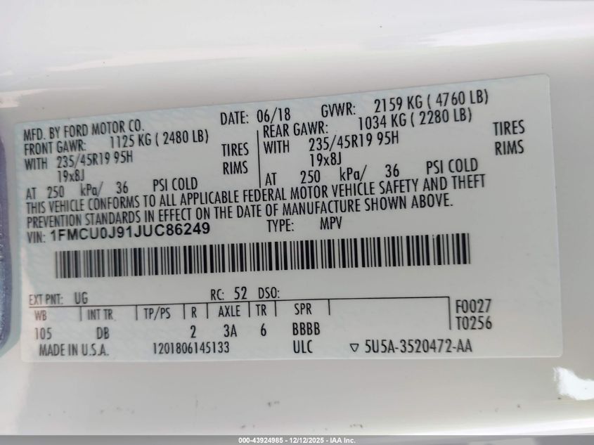 2018 FORD ESCAPE 2018 року Бензин, 2.0, Передний привод, vin - 1FMCU0J91JUC86249 из США