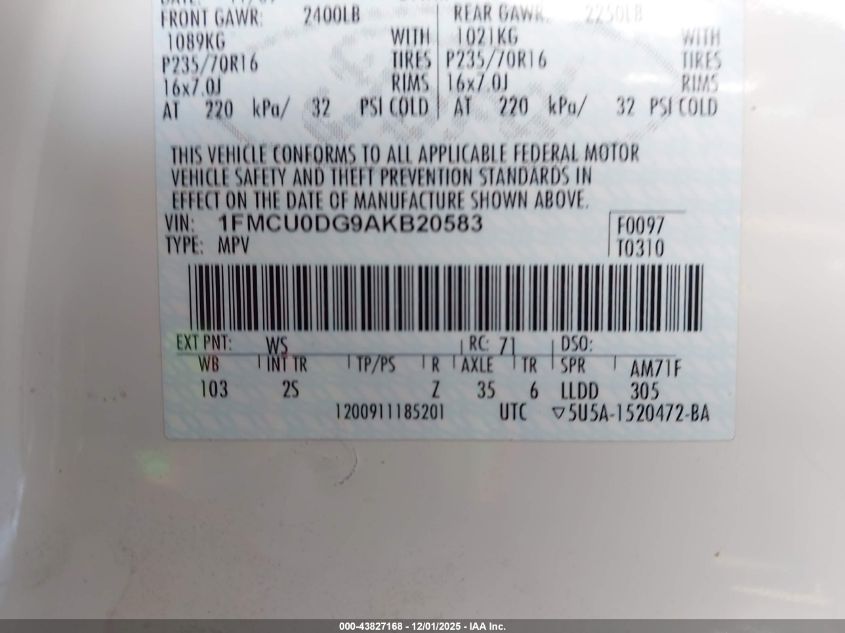 Цвет БелыйЦилиндры 6Привод Передний приводVIN 1FMCU0DG9AKB20583Состояние СтационарноПовреждения Обычный износ AutoRIA