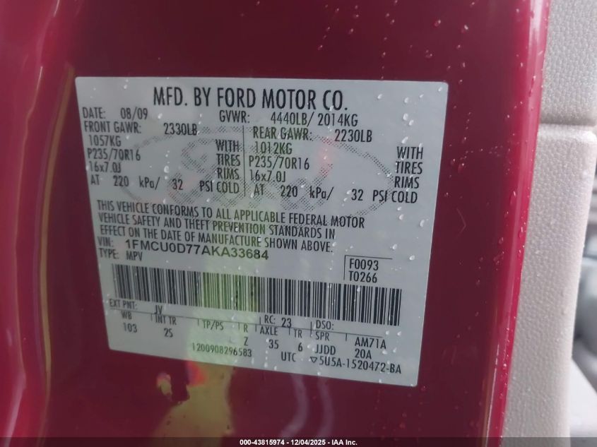 Цвет КрасныйЦилиндры 4Привод Передний приводVIN 1FMCU0D77AKA33684Состояние СтационарноПовреждения Незначительные AutoRIA