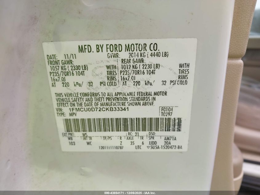 Цвет БелыйЦилиндры 4Привод Передний приводVIN 1FMCU0D72CKB33341Состояние СтационарноПовреждения Передняя или задняя AutoRIA