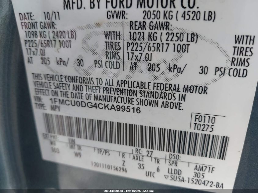 2012 FORD ESCAPE 2012 року Бензин, 3.0, Передний привод, vin - 1FMCU0DG4CKA99516 из США