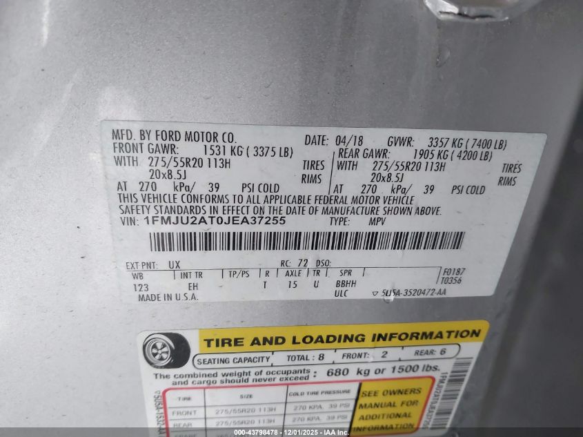 2018 FORD EXPEDITION 2018 року Бензин, 3.5, Полный привод, vin - 1FMJU2AT0JEA37255 из США