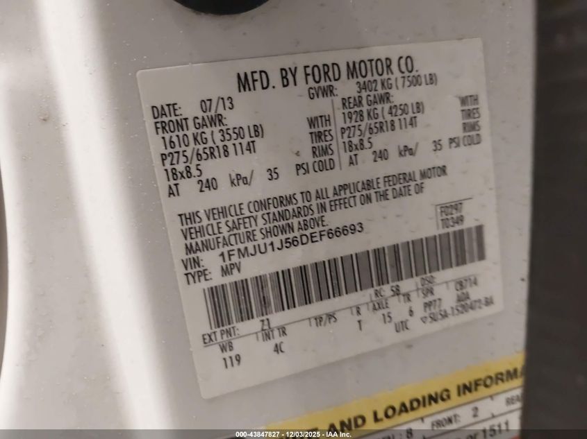 Цвет БелыйЦилиндры 8Привод Полный приводVIN 1FMJU1J56DEF66693Состояние СтационарноПовреждения Передняя левая AutoRIA