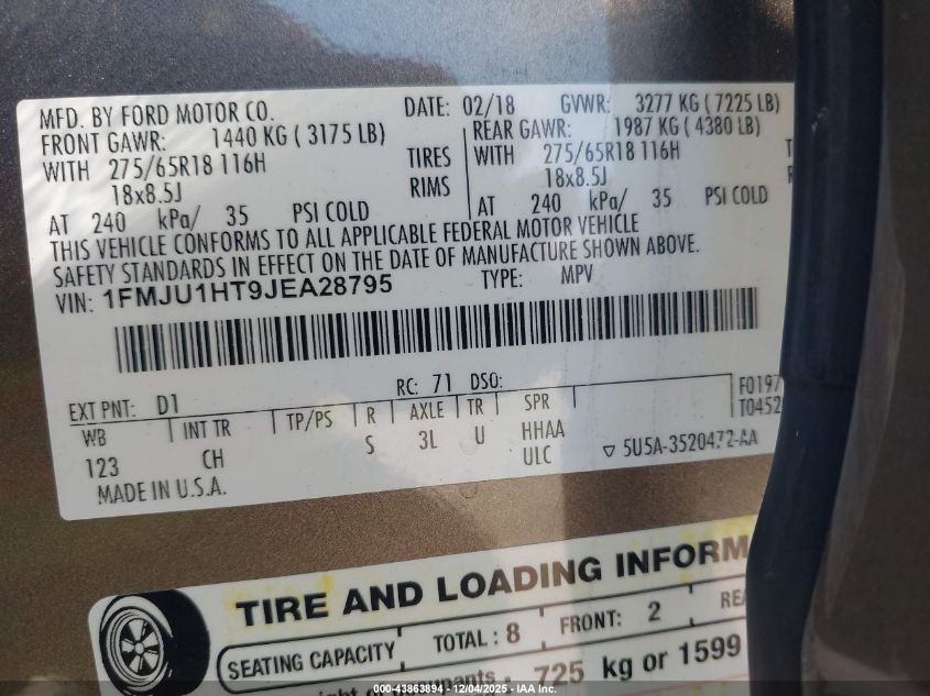 2018 FORD EXPEDITION 2018 року Бензин, 3.5, , vin - 1FMJU1HT9JEA28795 из США