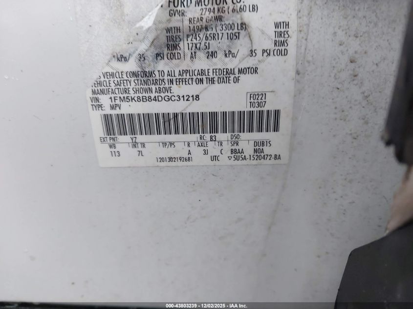 Цвет БелыйЦилиндры 6Привод Полный приводVIN 1FM5K8B84DGC31218Состояние СтационарноПовреждения Передняя или задняя AutoRIA