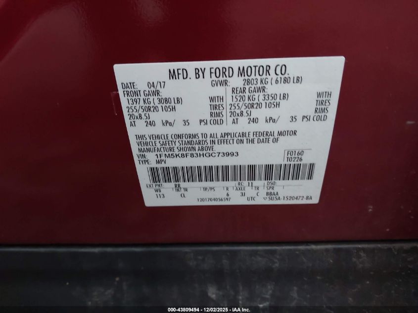 Цвет КрасныйЦилиндры 6Привод Полный приводVIN 1FM5K8F83HGC73993Состояние СтационарноПовреждения Передняя или задняя AutoRIA