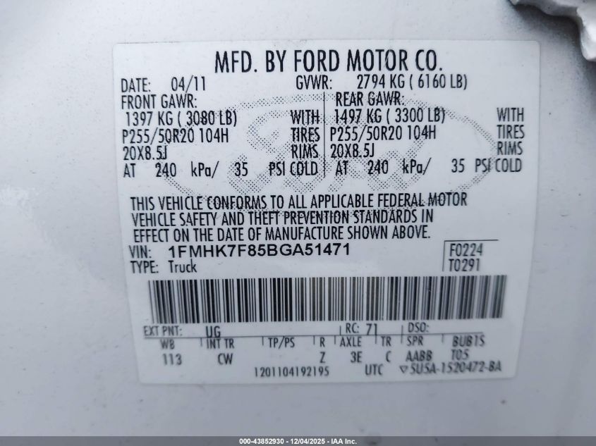 Цвет БелыйЦилиндры 6Привод Передний приводVIN 1FMHK7F85BGA51471Состояние Заводится и едет (проверено)Повреждения Передняя левая AutoRIA