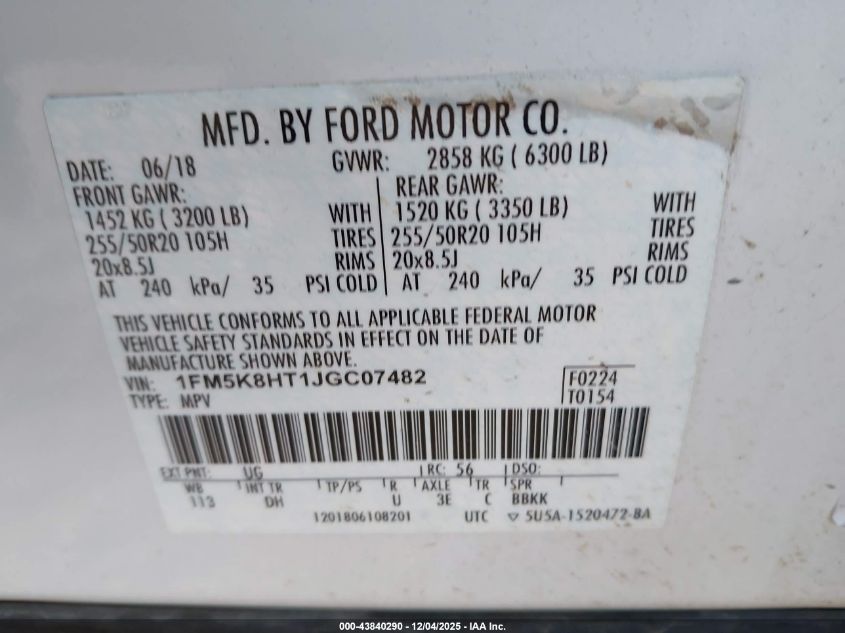 Цвет БелыйЦилиндры 6Привод Полный приводVIN 1FM5K8HT1JGC07482Состояние СтационарноПовреждения Передняя или задняя AutoRIA