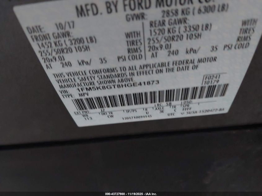 Цвет СерыйЦилиндры 6Привод Полный приводVIN 1FM5K8GT8HGE41873Состояние СтационарноПовреждения Передняя или задняя AutoRIA