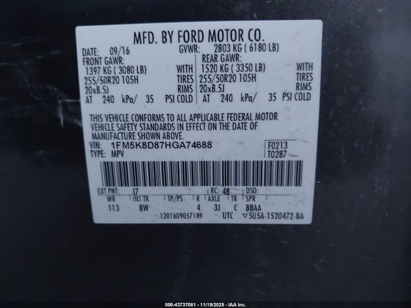 Цвет СерыйЦилиндры 6Привод Полный приводVIN 1FM5K8D87HGA74688Состояние СтационарноПовреждения Передняя или задняя AutoRIA