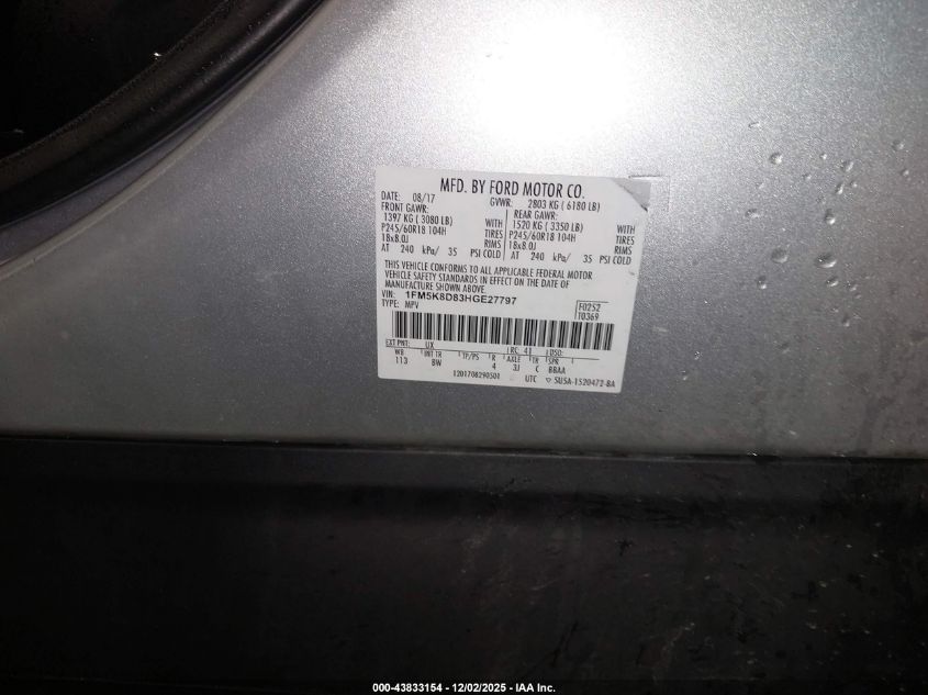 Цвет СерыйЦилиндры 6Привод Полный приводVIN 1FM5K8D83HGE27797Состояние СтационарноПовреждения Передняя или задняя AutoRIA