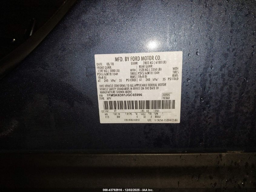 Цвет СинийЦилиндры 6Привод Полный приводVIN 1FM5K8D81JGC65996Состояние Заводится и едет (проверено)Повреждения Передняя или задняя AutoRIA