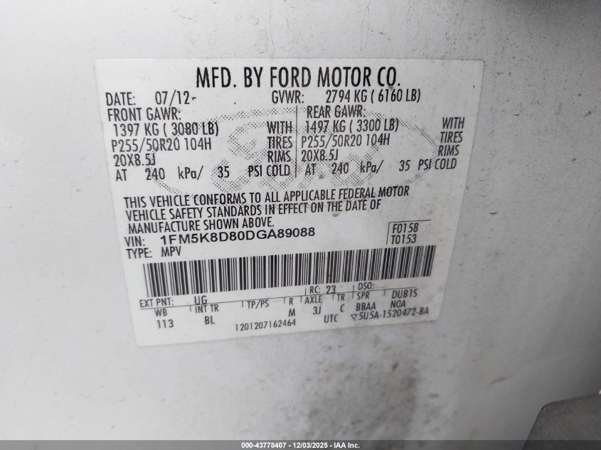 Цвет БелыйЦилиндры 6Привод Полный приводVIN 1FM5K8D80DGA89088Состояние Заводится и едет (проверено)Повреждения Передняя левая AutoRIA