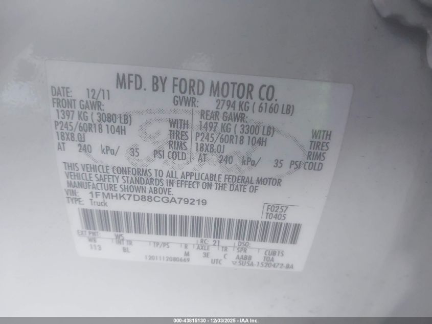 Цвет БелыйЦилиндры 6Привод Передний приводVIN 1FMHK7D88CGA79219Состояние СтационарноПовреждения Неизвестно AutoRIA