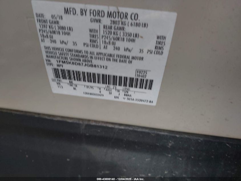 Цвет БелыйЦилиндры 6Привод Полный приводVIN 1FM5K8D87JGB81312Состояние Заводится и едет (проверено)Повреждения Левая сторона AutoRIA