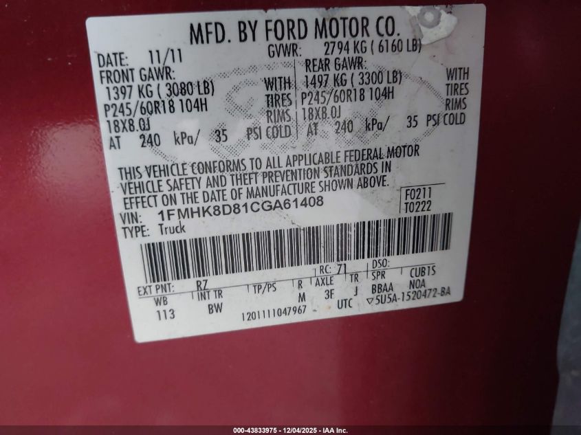Цвет КрасныйЦилиндры 6Привод Полный приводVIN 1FMHK8D81CGA61408Состояние ЗаводитсяПовреждения Передняя или задняя AutoRIA