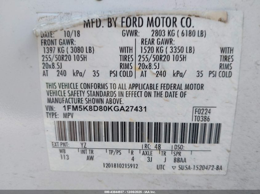 Цвет БелыйЦилиндры 6Привод Полный приводVIN 1FM5K8D80KGA27431Состояние Заводится и едет (проверено)Повреждения Передняя или задняя AutoRIA