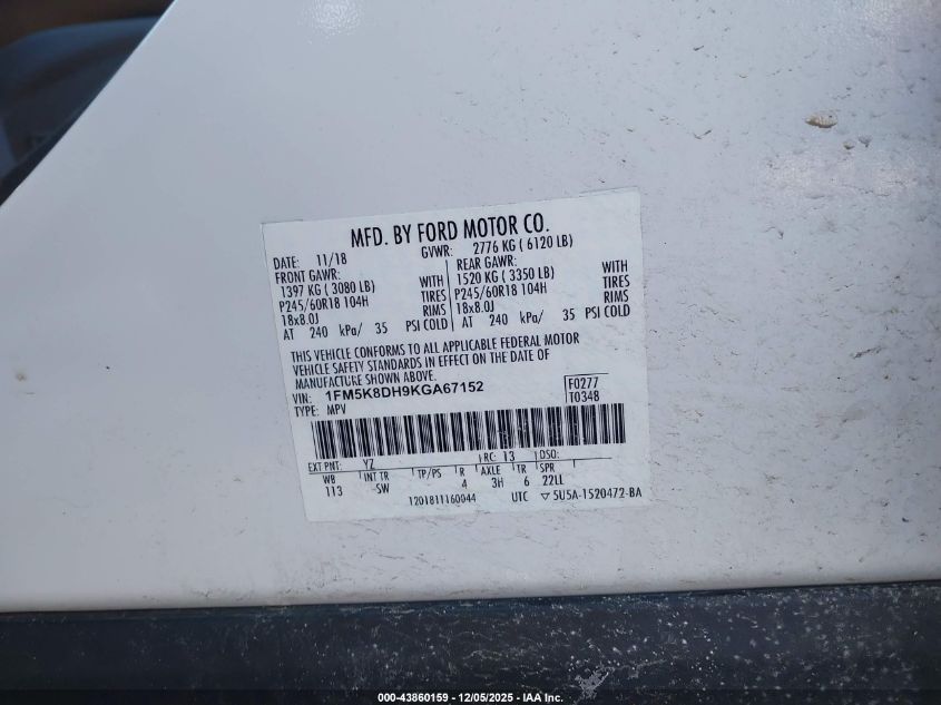 Цвет БелыйЦилиндры 4Привод Полный приводVIN 1FM5K8DH9KGA67152Состояние Заводится и едет (проверено)Повреждения Неизвестно AutoRIA