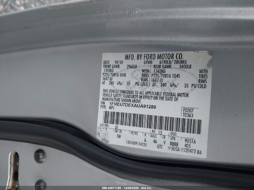 Цвет СерыйЦилиндры 6Привод Полный приводVIN 1FMEU7DEXAUA91289Состояние СтационарноПовреждения Передняя и задняя AutoRIA