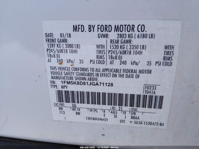 Цвет БелыйЦилиндры 6Привод Полный приводVIN 1FM5K8D81JGA71128Состояние Заводится и едет (проверено)Повреждения Передняя или задняя AutoRIA