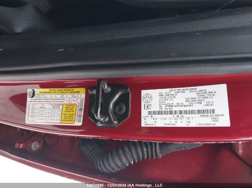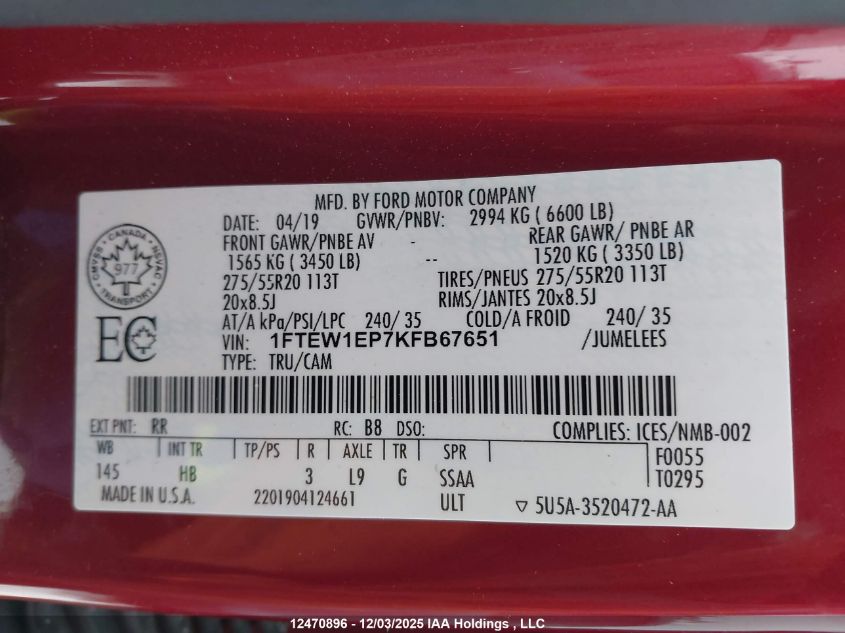 2019 FORD F-150 2019 року Бензин, , Полный привод, vin - 1FTEW1EP7KFB67651 из США
