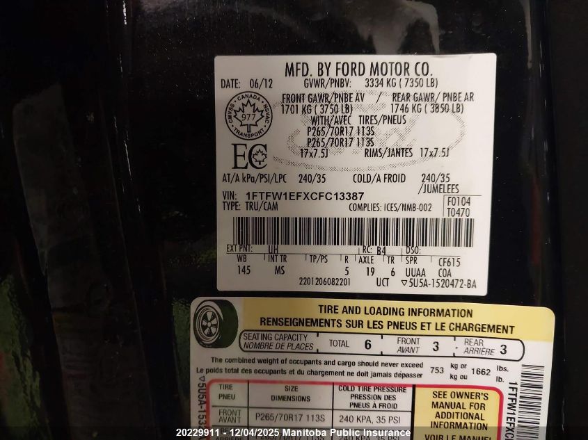Цвет ЧерныйЦилиндры 8Привод Полный приводVIN 1FTFW1EFXCFC13387Состояние СтационарноПовреждения ПередняяДата аукциона 2025-12-10 AutoRIA