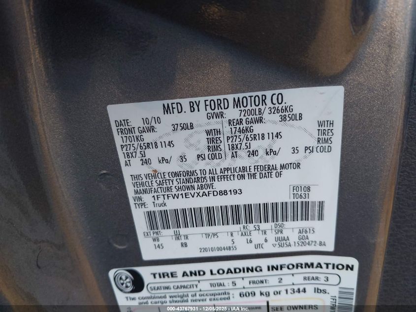 2010 FORD F-150 2010 року Бензин, 5.4, Полный привод, vin - 1FTFW1EVXAFD88193 из США