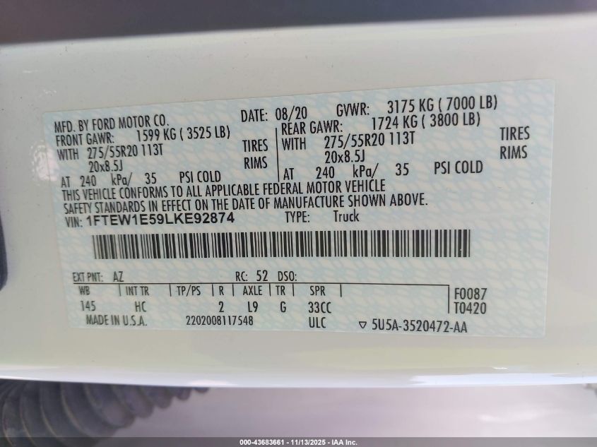 2020 FORD F-150 2020 року Бензин, 5.0, Полный привод, vin - 1FTEW1E59LKE92874 из США