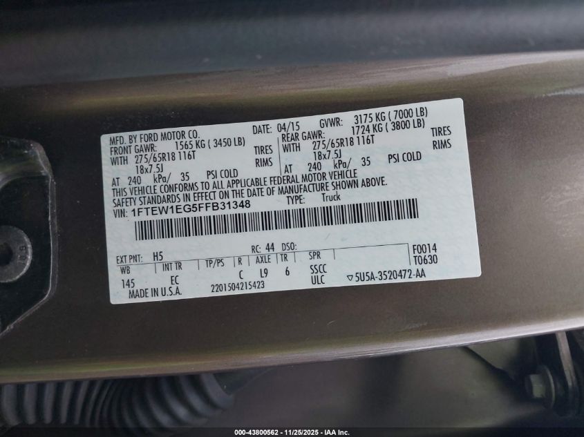 2015 FORD F-150 2015 року Бензин, 3.5, Полный привод, vin - 1FTEW1EG5FFB31348 из США