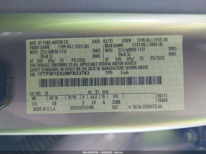 2021 FORD F-150 2021 року Бензин, 3.5, Полный привод, vin - 1FTFW1E82MFB23783 из США