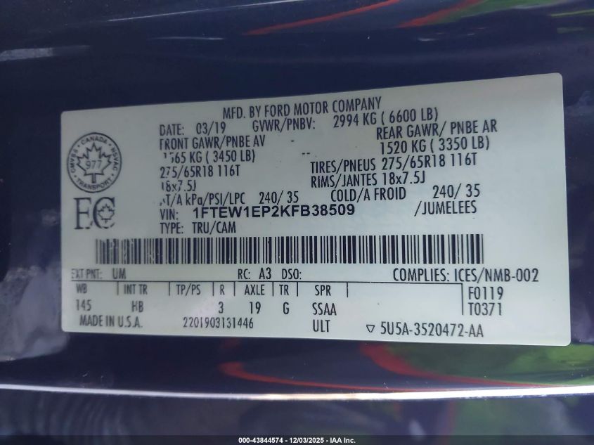 2019 FORD F-150 2019 року Бензин, 2.7, Полный привод, vin - 1FTEW1EP2KFB38509 из США