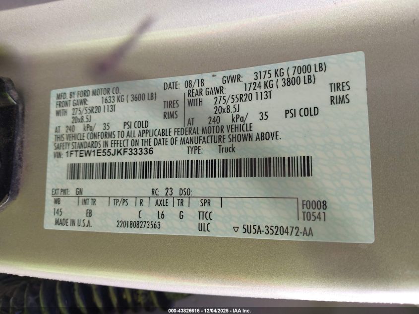 2018 FORD F-150 2018 року Бензин, 5.0, Полный привод, vin - 1FTEW1E55JKF33336 из США