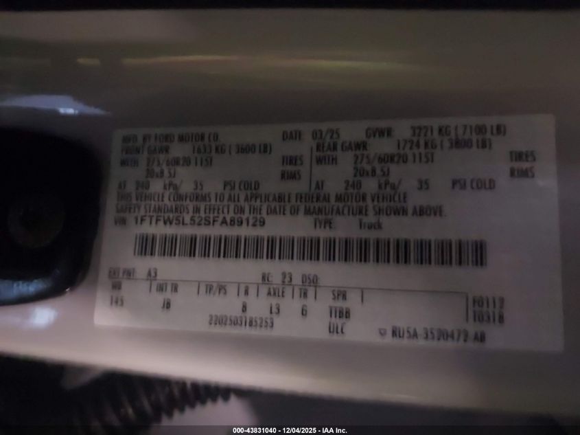 2025 FORD F-150 2025 року Бензин, 5.0, Полный привод, vin - 1FTFW5L52SFA89129 из США