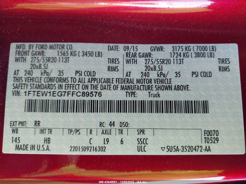 2015 FORD F-150 2015 року Бензин, 3.5, Полный привод, vin - 1FTEW1EG7FFC89576 из США