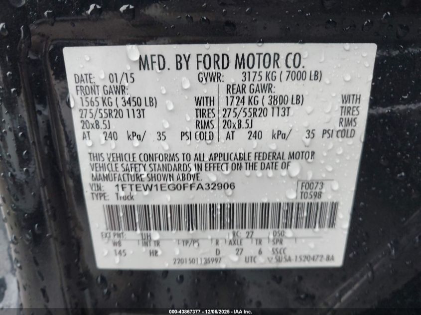 2015 FORD F-150 2015 року Бензин, 3.5, Полный привод, vin - 1FTEW1EG0FFA32906 из США