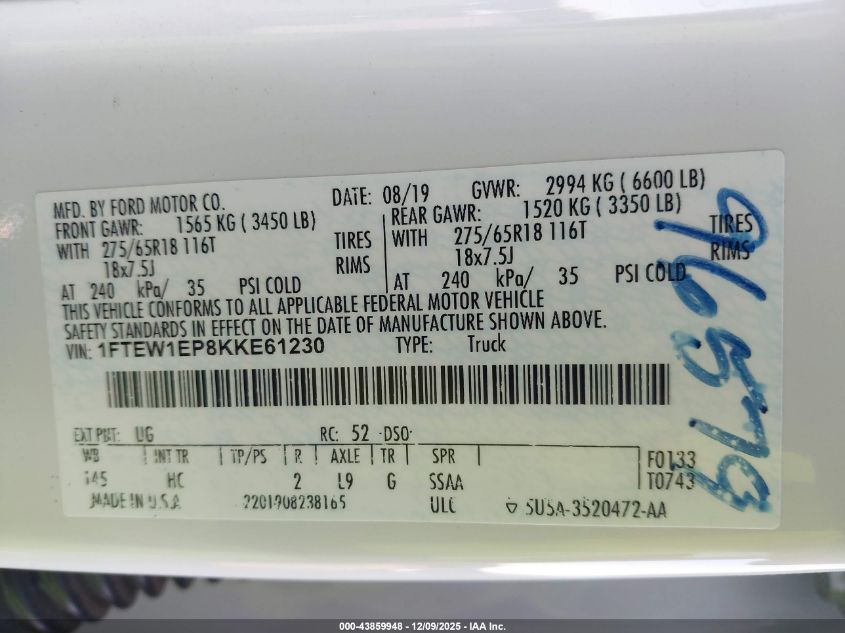 Цвет БелыйЦилиндры 6Привод Полный приводVIN 1FTEW1EP8KKE61230Состояние Заводится и едет (проверено)Повреждения Передняя или задняя AutoRIA