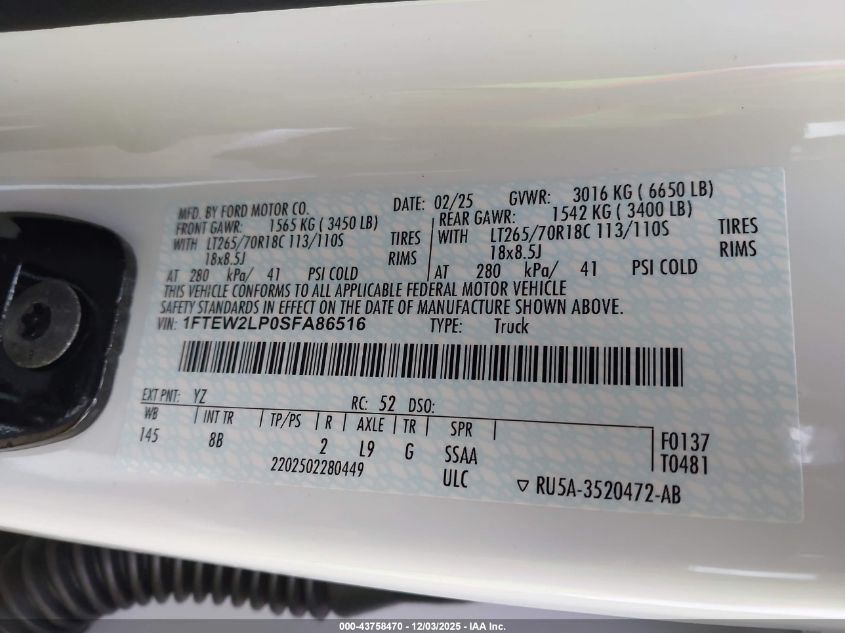 2025 FORD F-150 2025 року Бензин, 2.7, Полный привод, vin - 1FTEW2LP0SFA86516 из США
