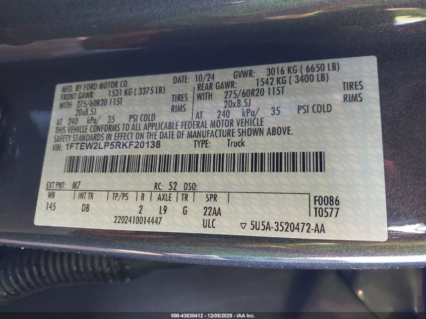2024 FORD F-150 2024 року Бензин, 2.7, Полный привод, vin - 1FTEW2LP5RKF20138 из США