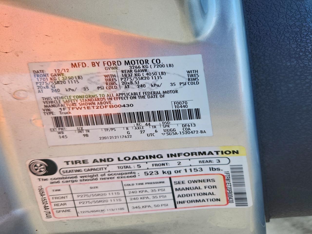 2013 FORD F-150 2013 року Бензин, 3.5, 4x4 с задним приводом, vin - 1FTFW1ET2DFB00430 из США