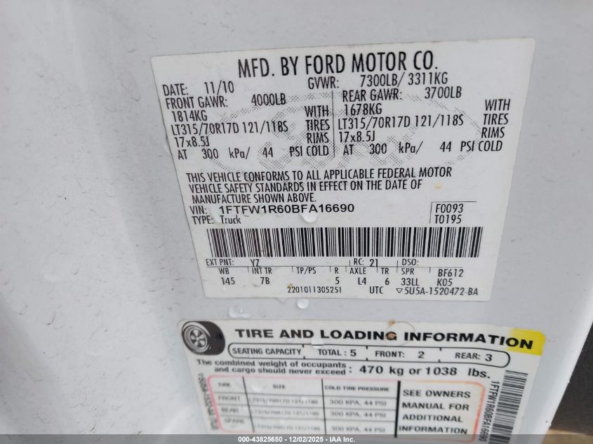 2011 FORD F-150 2011 року Бензин, 6.2, Полный привод, vin - 1FTFW1R60BFA16690 из США