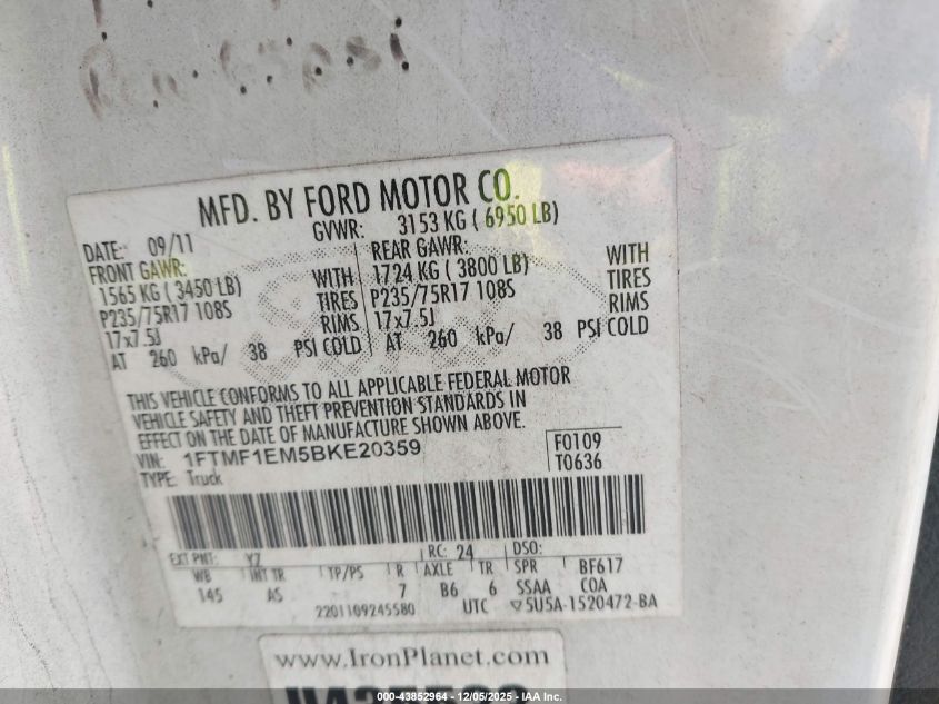 Цвет БелыйЦилиндры 6Привод Полный приводVIN 1FTMF1EM5BKE20359Состояние Заводится и едет (проверено)Повреждения Передняя или задняя AutoRIA