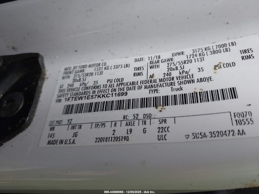 2019 FORD F-150 2019 року Бензин, 5.0, Полный привод, vin - 1FTEW1E57KKC11699 из США