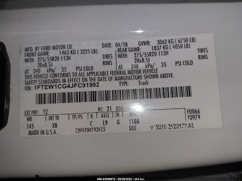 Цвет БелыйЦилиндры 6VIN 1FTEW1CG4JFC91992Состояние СтационарноПовреждения Передняя или задняя AutoRIA
