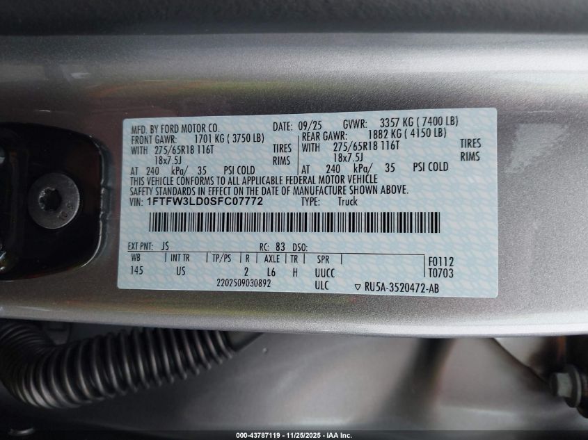 2025 FORD F-150 2025 року Гибрид, 3.5, Полный привод, vin - 1FTFW3LD0SFC07772 из США
