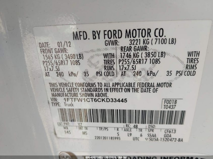Цвет БелыйЦилиндры 6VIN 1FTFW1CT6CKD33445Состояние СтационарноПовреждения Задняя AutoRIA