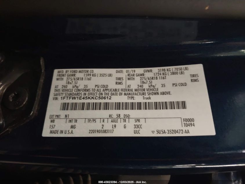 2019 FORD F-150 2019 року Бензин, 3.5, Полный привод, vin - 1FTFW1E45KKC50612 из США