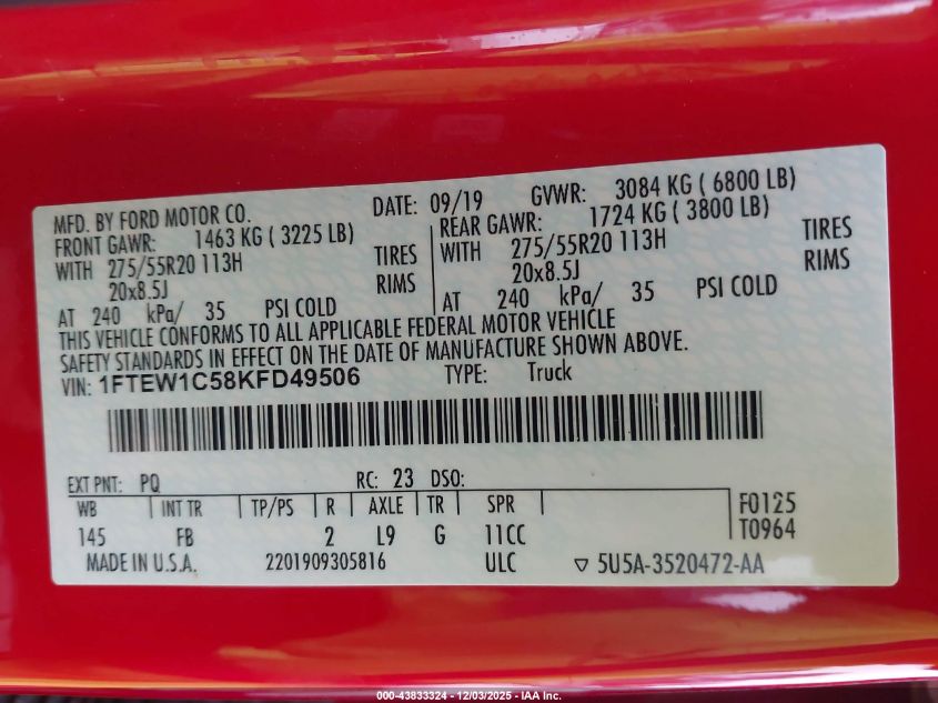 Цвет КрасныйЦилиндры 8VIN 1FTEW1C58KFD49506Состояние Заводится и едет (проверено)Повреждения Передняя или задняя AutoRIA